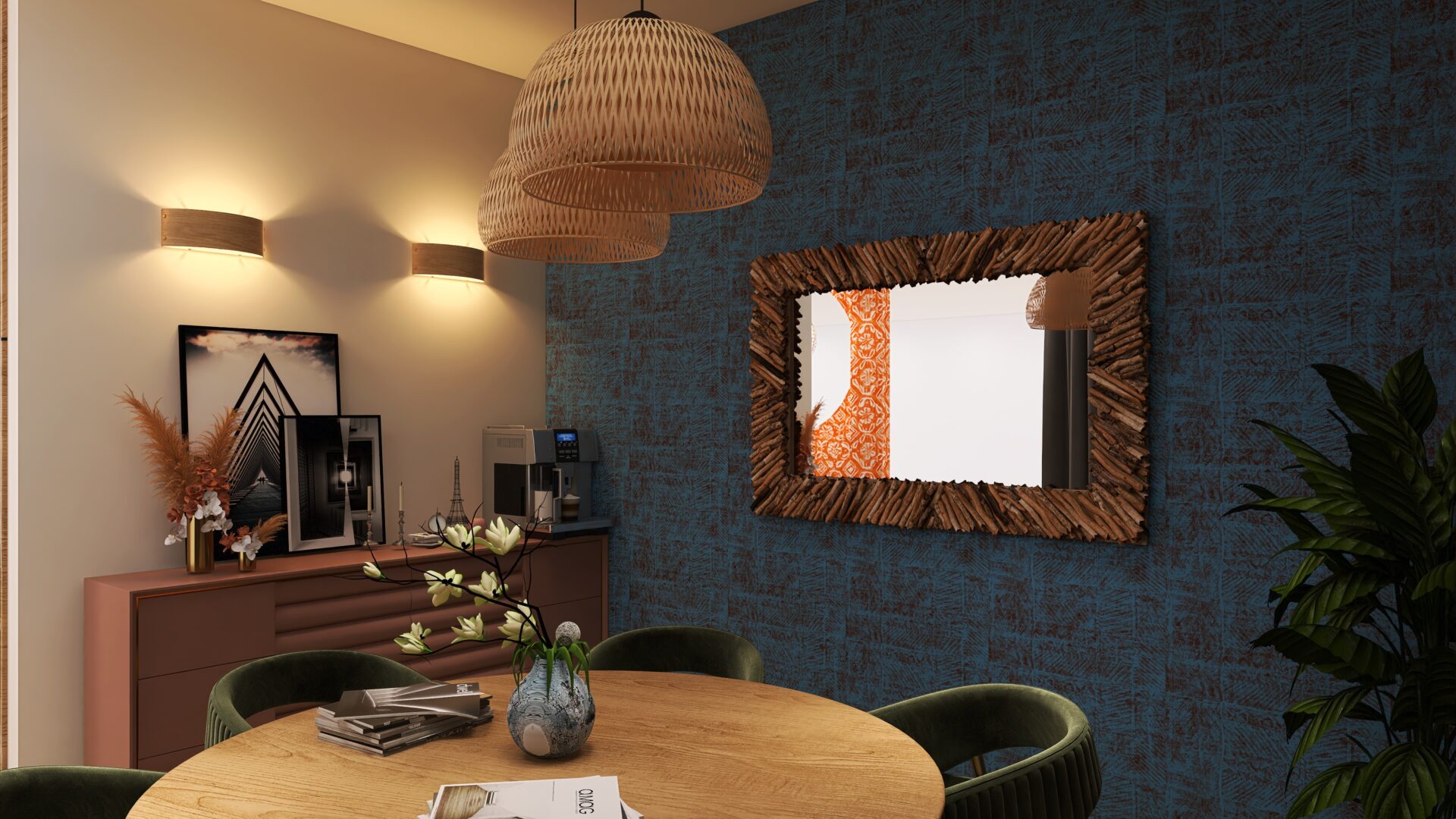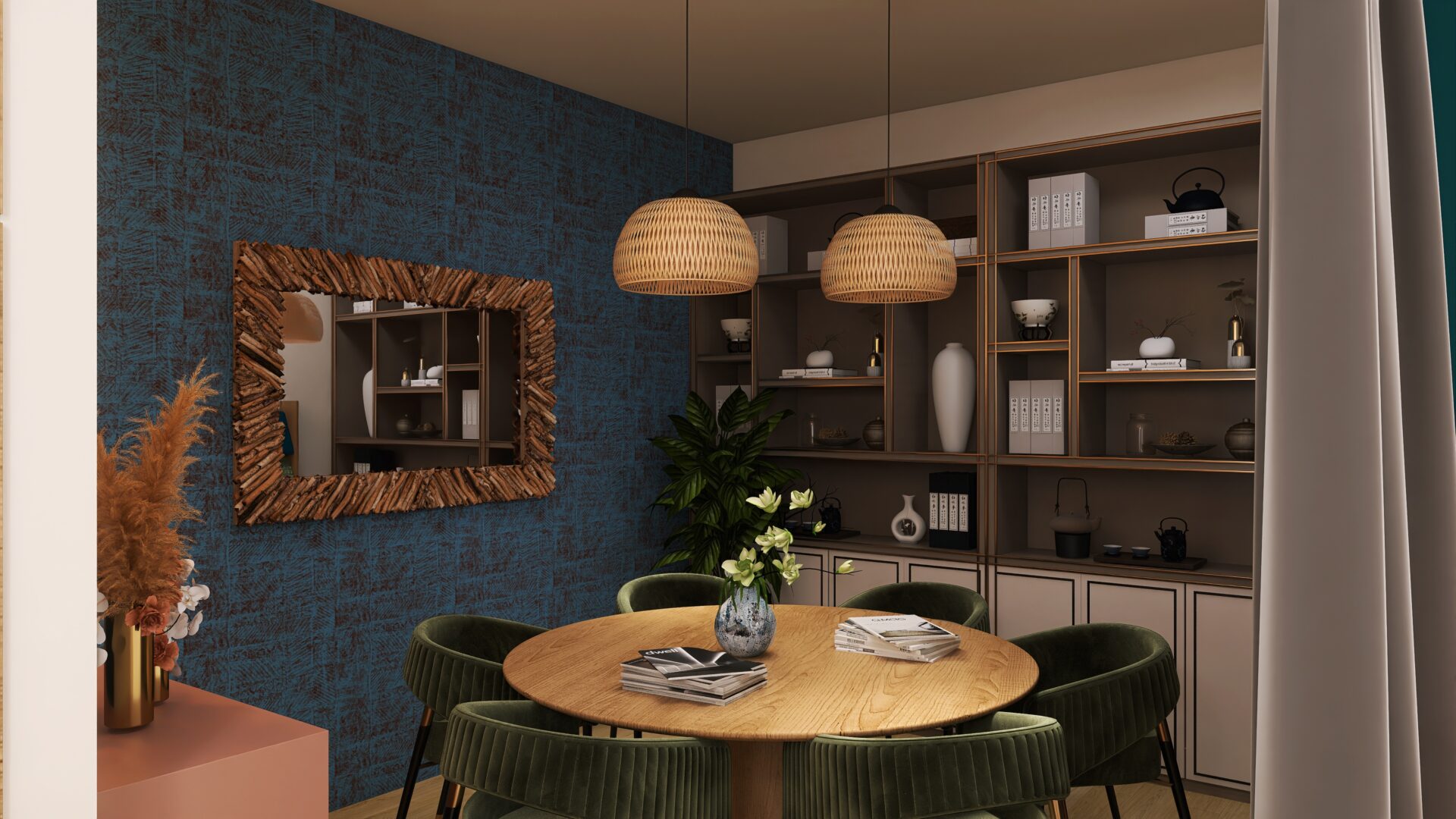 Egy külön kiemelt, látványos elem, ahol az egyes karakteres székek önálló hangsúlyt kapnak. A növényfal hátteret ad a bútoroknak, miközben erős vizuális fókuszpontot hoz létre.