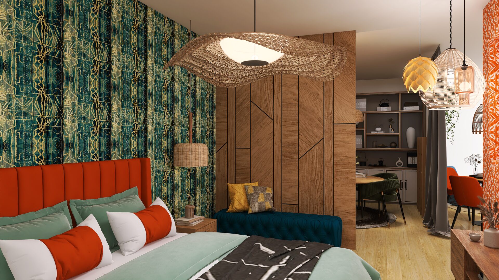 Egy komplett, prémium hotel szoba enteriőrje, amely a bútorok, tapéták és lakástextilek együttes alkalmazását mutatja meg. A hangsúly az anyaghasználaton, a rétegzett textíliákon és a hangulati világításon van.