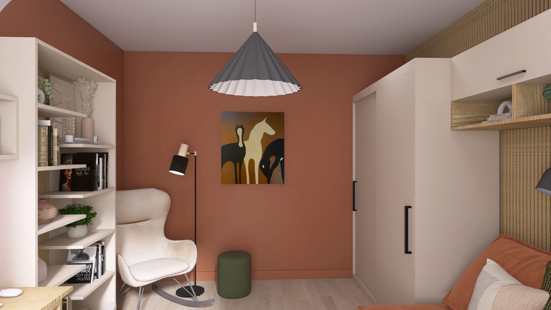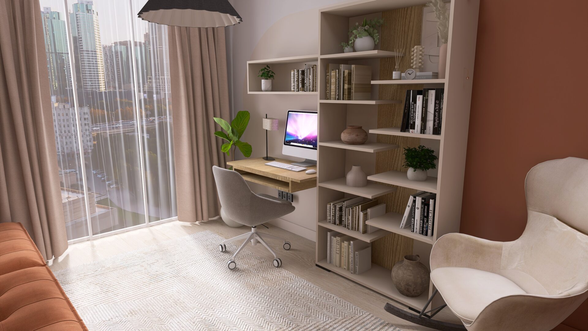 A tér világosan tagolt, mégis egységes egészként működik. A home office zóna természetes fény mellett kapott helyet, míg az olvasósarok elkülönülten, nyugodt hangulatot teremt. A kanapé vendégfogadásra és pihenésre egyaránt alkalmas, a tárolóelemek pedig nemcsak praktikus szerepet töltenek be, hanem vizuálisan is keretezik és strukturálják a teret. A bemutatótermi környezethez igazodva a térkapcsolatok átláthatók, jól értelmezhetők, így a látogató könnyen felismerheti a funkciókat és azok egymáshoz való viszonyát.