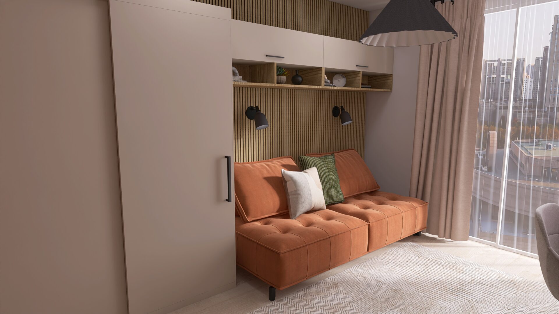 A koncepció alapja a multifunkcionalitás: a bemutatott helyiség egyszerre szolgál nappaliként, vendégszobaként, otthoni munkavégzésre alkalmas térként és gardrób funkcióval rendelkező szobaként. Ez a sokoldalúság különösen fontos egy bemutatóteremben, ahol egyetlen enteriőrnek több élethelyzetet is reprezentálnia kell.