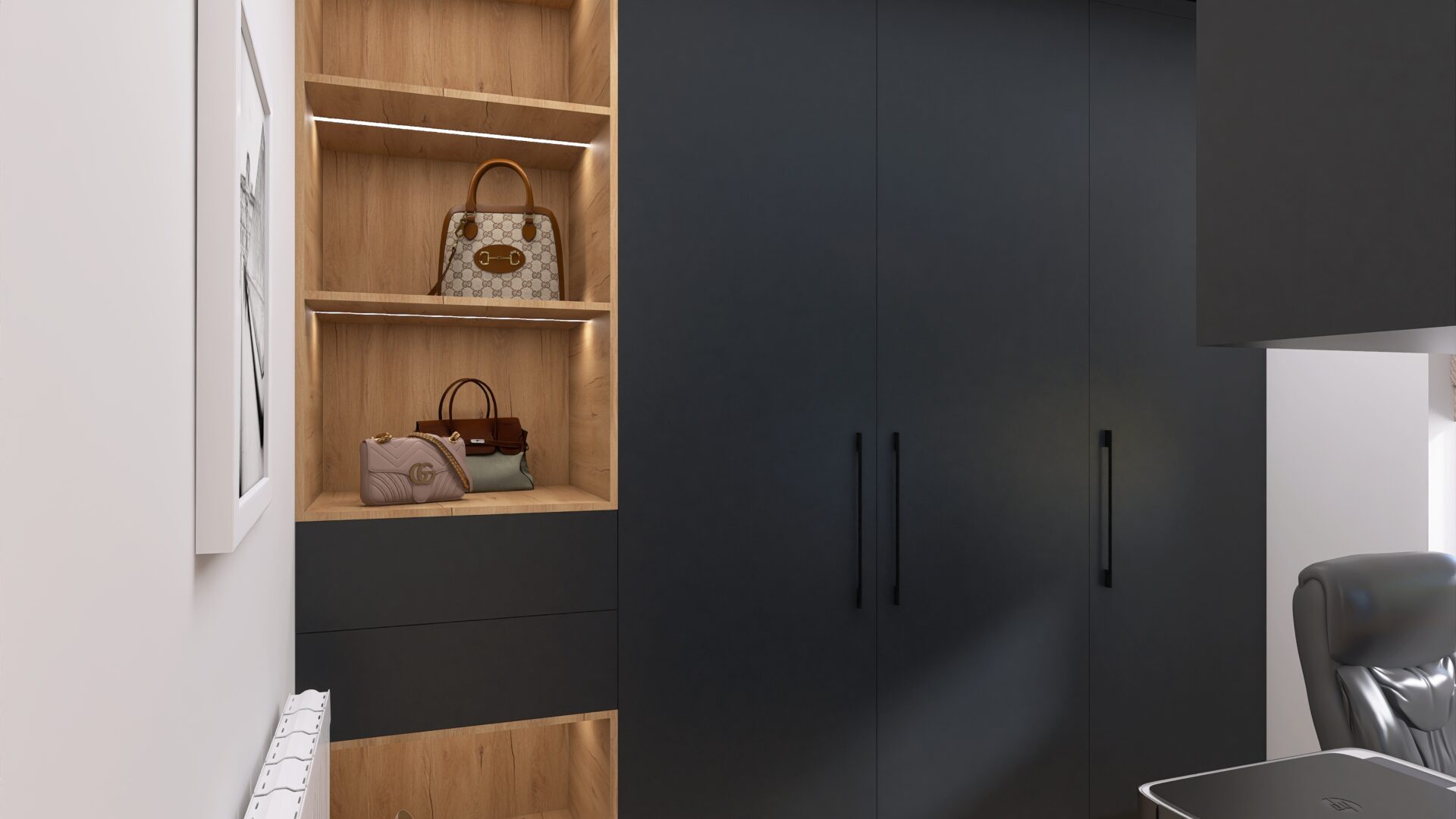 Minden helyiség tudatosan több funkció mentén került kialakításra. A dolgozószoba gardróbként is működik, a nappali pedig egy külön olvasósarokkal gazdagodott. A térkihasználás kulcsa az egyedi, méretre tervezett bútorozás volt, amely a rendelkezésre álló falszakaszokat és beugrókat maximálisan hasznosítja, miközben vizuálisan nem terheli túl az enteriőrt.