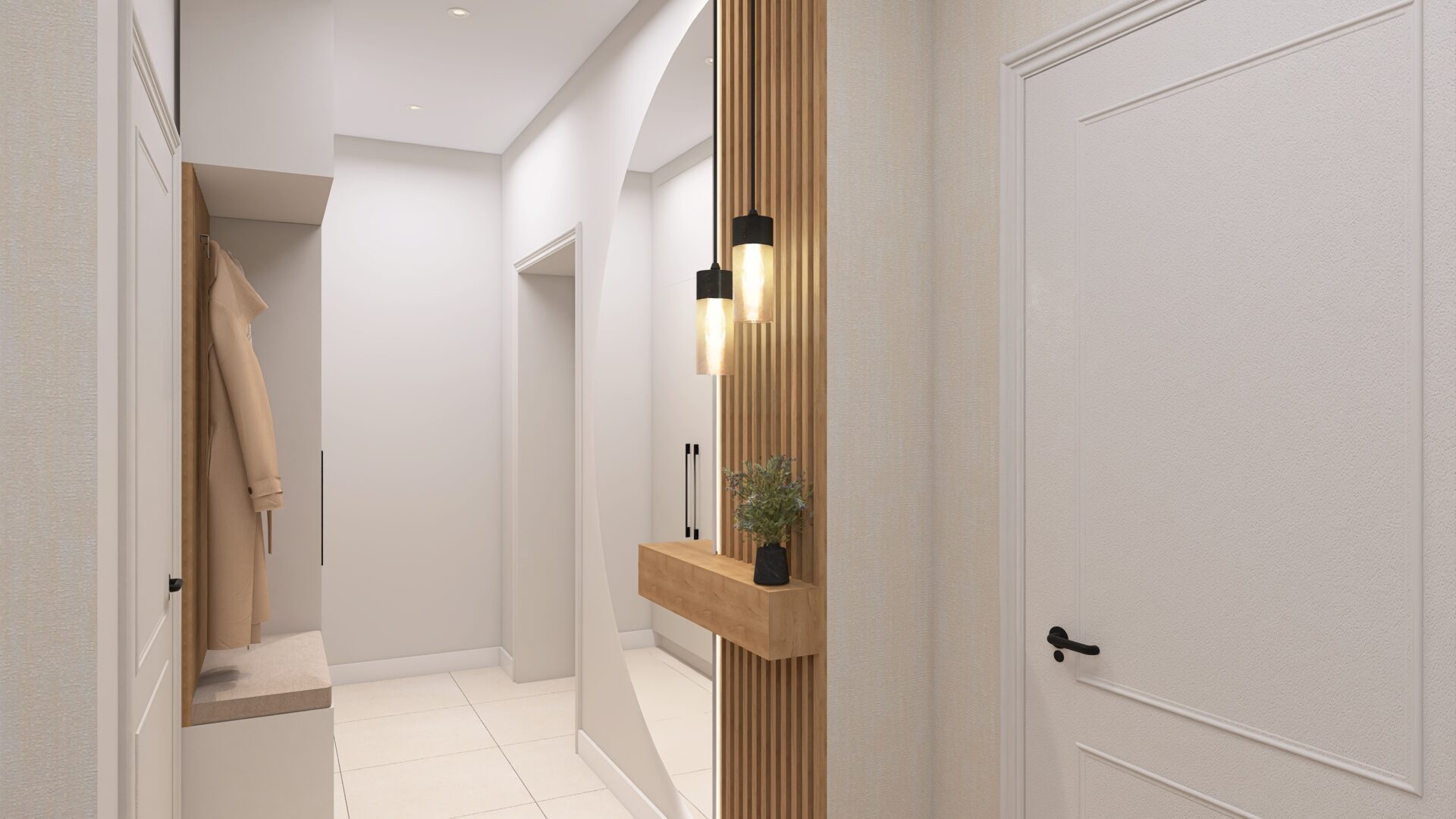Az előszoba átmeneti térként nem csupán közlekedő, hanem tudatosan szervezett tárolózóna is, amely már az érkezés pillanatában rendezettséget és funkcionalitást sugall.