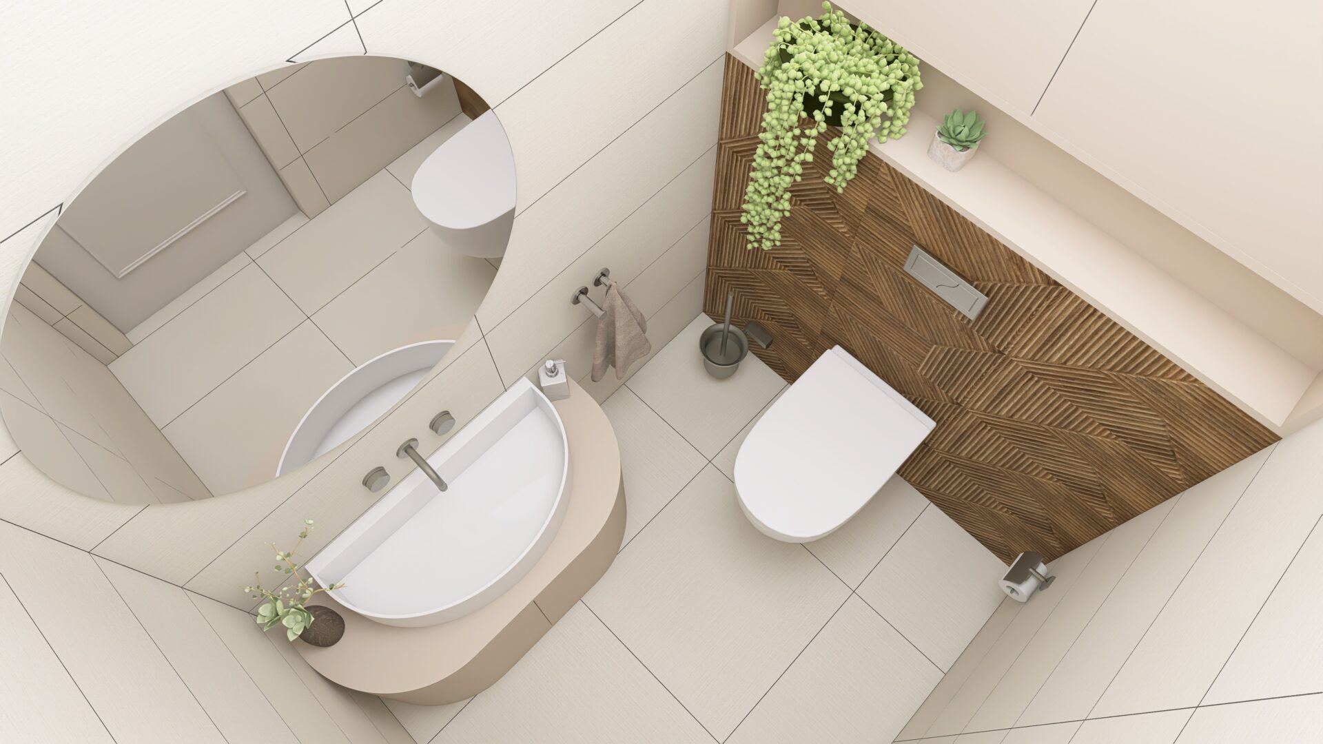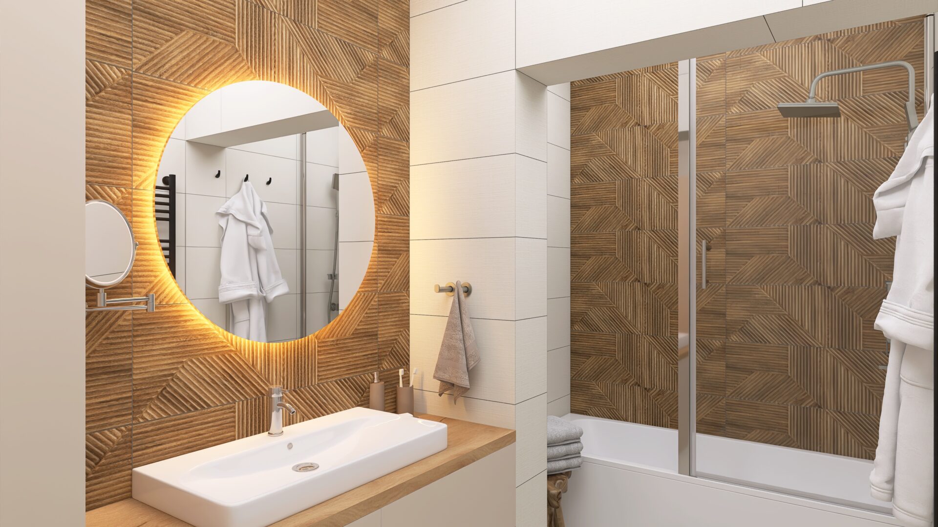 A koncepciót a tudatosan megválasztott részletek teszik teljessé. A fürdőszobában a kör formájú, háttérvilágított tükör nemcsak funkcionális elem, hanem vizuális fókuszpont is, amely lágy fényével meleg hangulatot teremt. A geometrikus mintázatú, meleg tónusú burkolat textúrát és mélységet ad a térnek, miközben természetes anyaghatásával kapcsolódik a ház egészének fa–bézs világához.