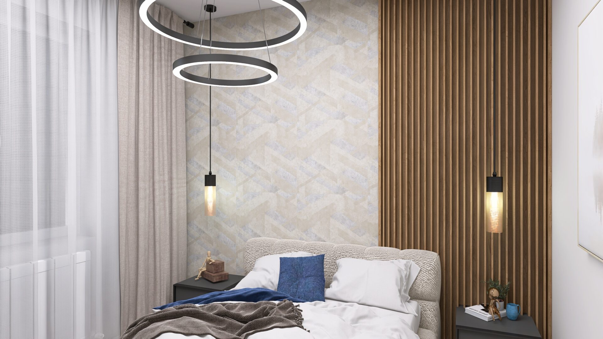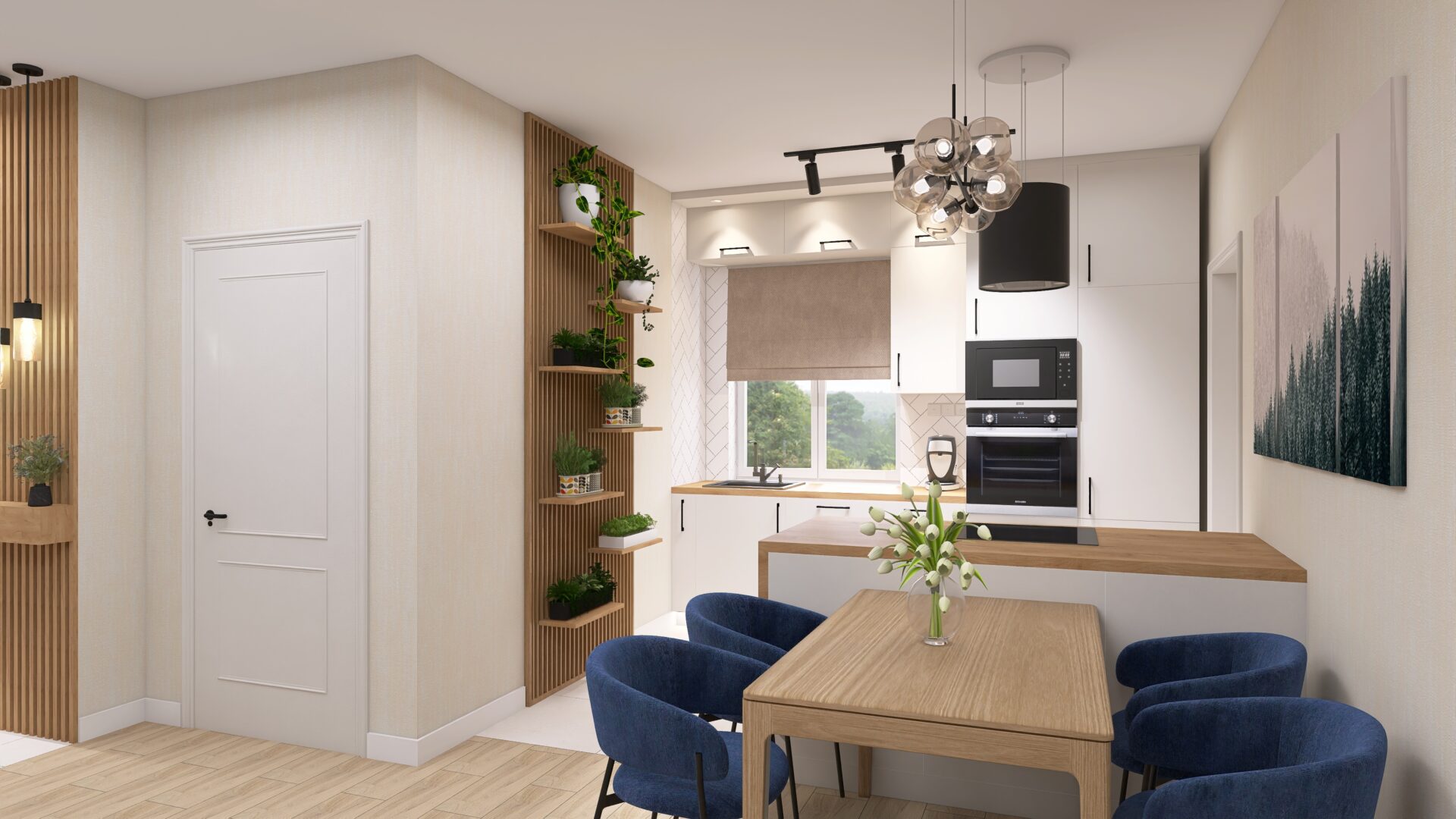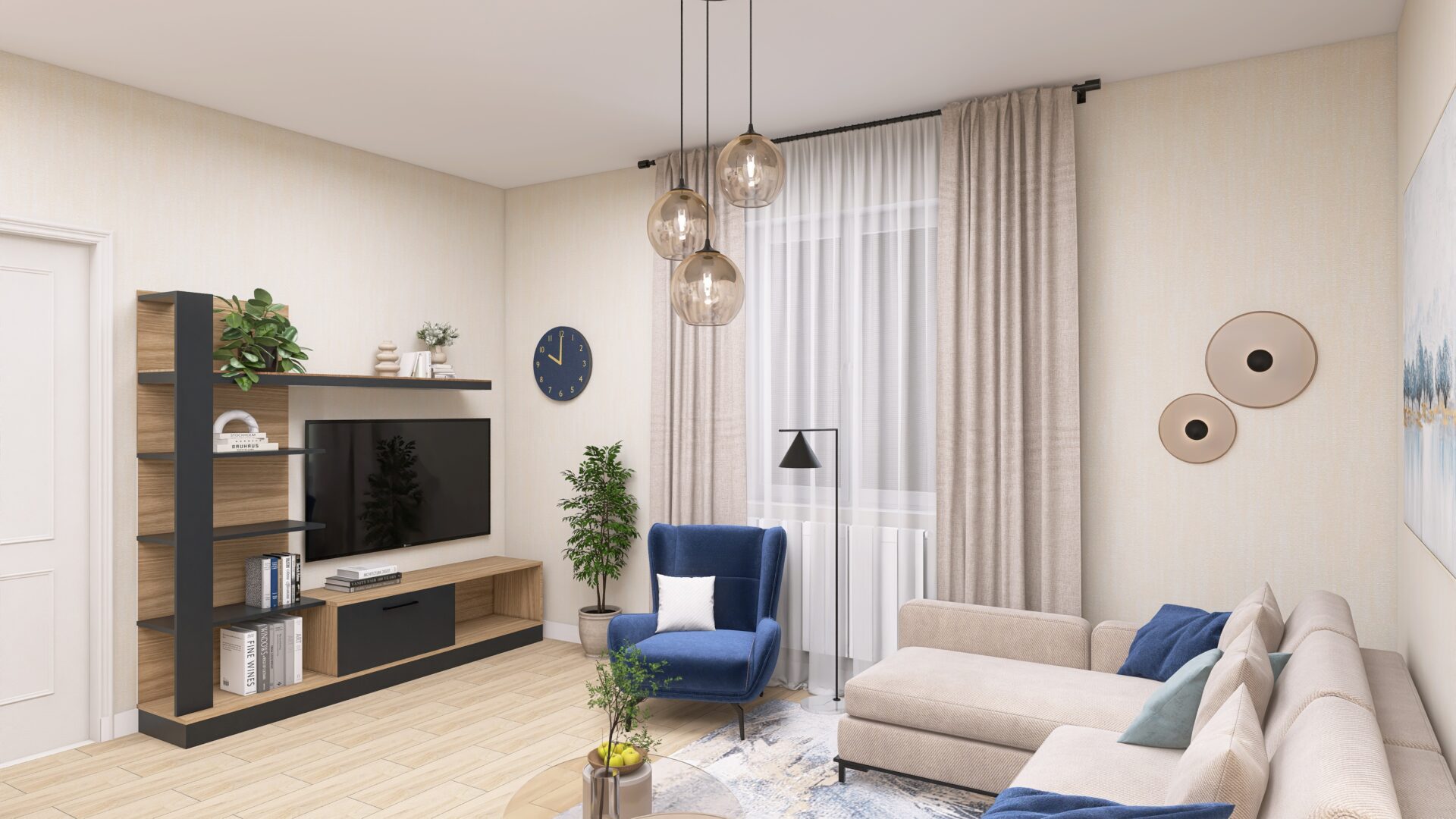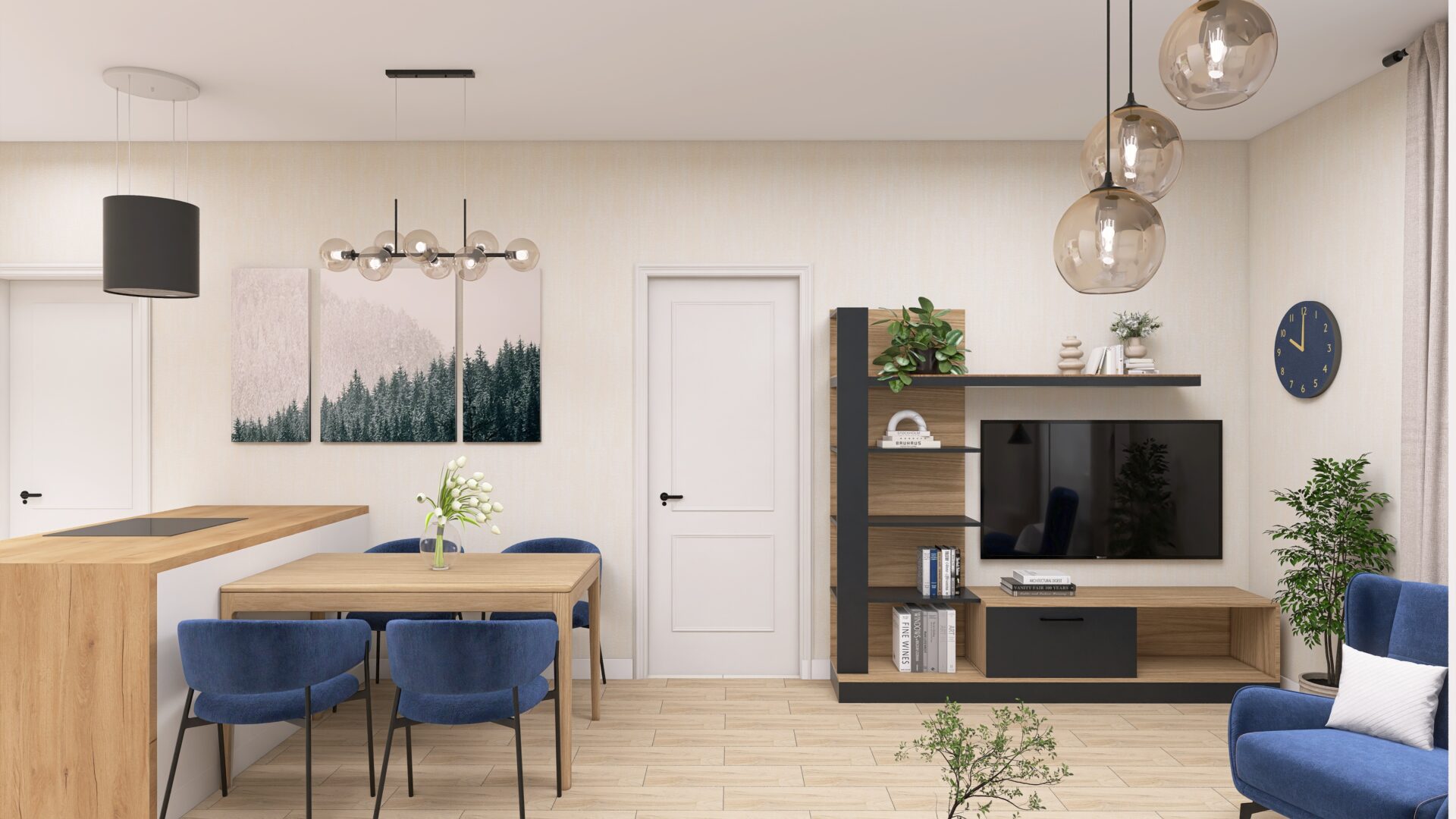 A kék árnyalatok karaktert adnak a térnek, míg a világos fa felületek és bézs alapok meleg, barátságos atmoszférát teremtenek.