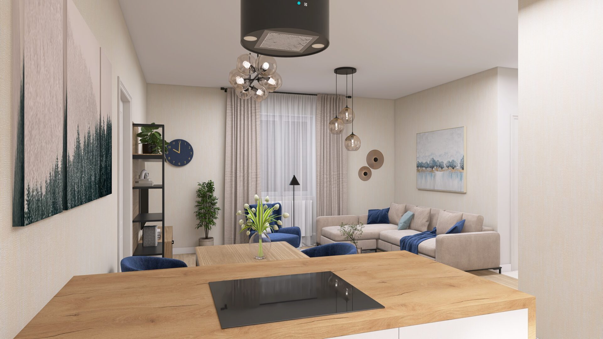 A kiindulási állapot egy tagolt, funkcióiban nem teljesen átgondolt tér volt, amely nem használta ki megfelelően az adottságait. A megbízók világos elképzeléssel érkeztek: modern, de nem hideg enteriőrt szerettek volna, kék színnel, természetes fa felületekkel, és költséghatékony megoldásokkal.
