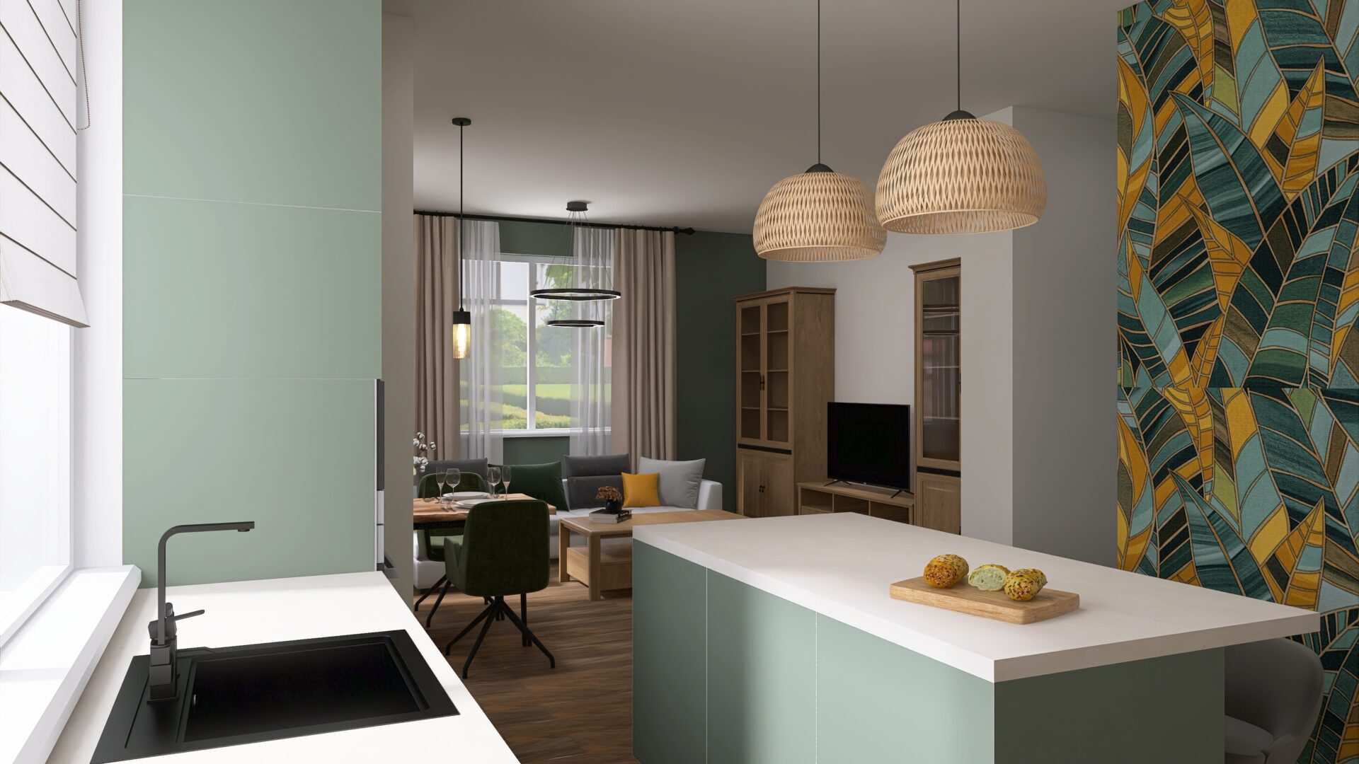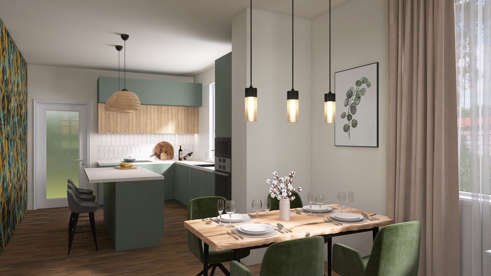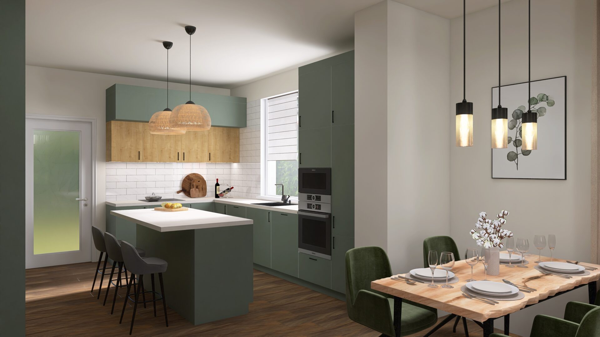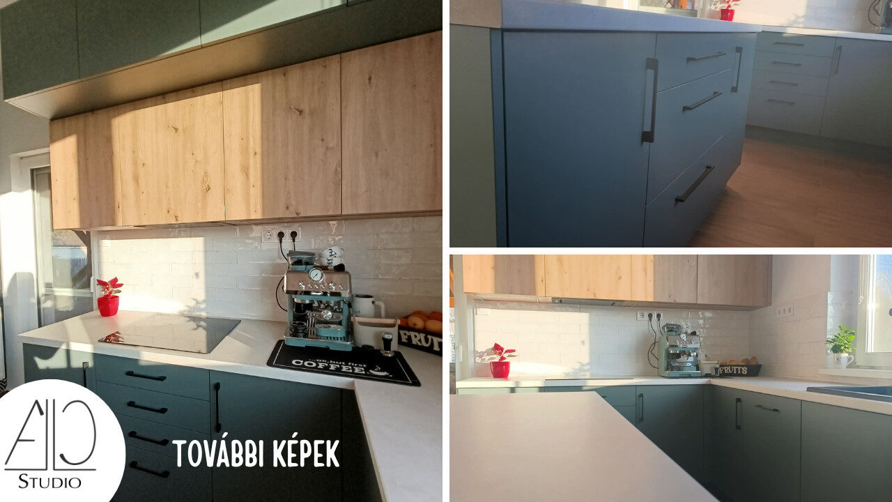 A koncepció alapját a természetközeli színvilág és az időtálló formavilág adta. A zöld tónusú konyhabútorok nyugodt, harmonikus hátteret teremtenek, amelyet a világos munkapultok és a fa felületek melegítenek fel. A felső és alsó szekrények arányos kiosztása, letisztult megjelenés modern, mégis barátságos összhatást eredményez.