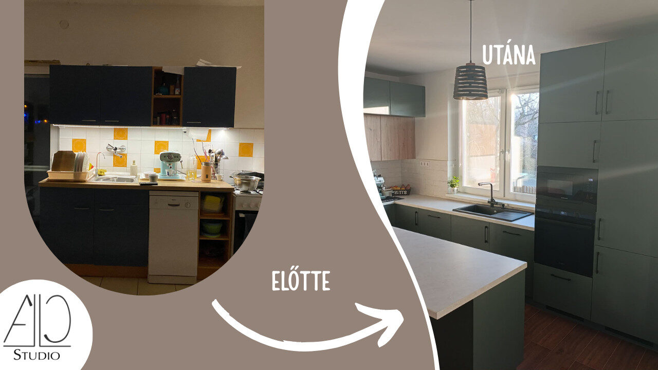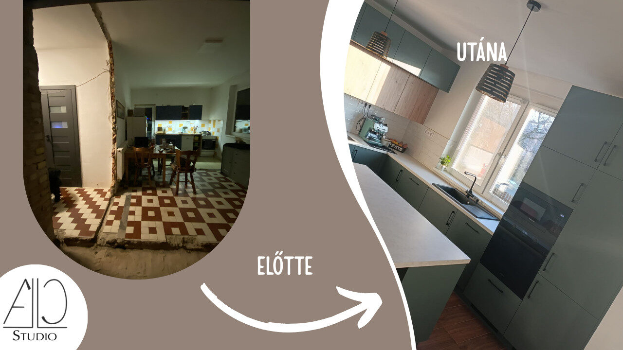 A kiindulási állapot egy zárt, sötétebb hangulatú konyha volt, amely funkcionálisan és vizuálisan sem kapcsolódott megfelelően a lakás többi részéhez. A meglévő bútorozás tagolt, a munkafelületek korlátozottak voltak, a tér pedig nem támogatta sem a kényelmes főzést, sem a közösségi használatot.